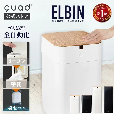【QUADS公式】[ブラックフライデーSALE] QUADS 全自動スマートゴミ箱 ELBIN 木目 UV機能付き 充電式 USB 音声ガイダンス クワッズ 【メーカー保証付き】ELBIN(エルビン)は、一般的な自動開閉ゴミ箱とは違い、ゴミ袋の交換や密閉までを自動で行ってくれます。