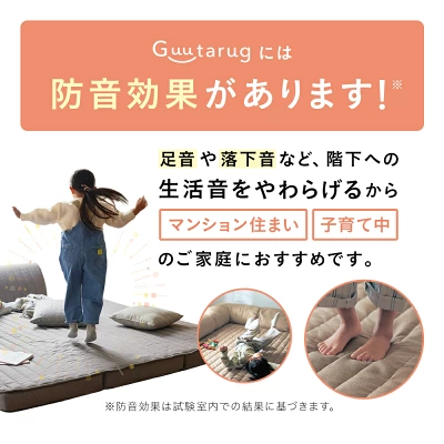 グータラグの大きな特徴の一つに、ラグの下に厚めのウレタンチップマットがプラスされている点がありますね。このマットの厚み(4cmタイプの場合)により床付きを感じにくく、座ったり寝転んだりしても快適。