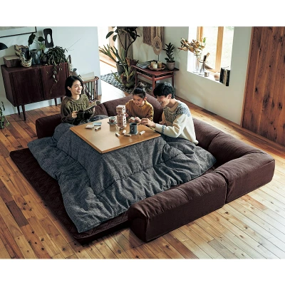 グータラグは、ローソファーの特性を活かしてこたつと一緒に活用できる設計になっていますよ。マットの上にこたつを置けば、冬場も暖かくゆったりと過ごせます。