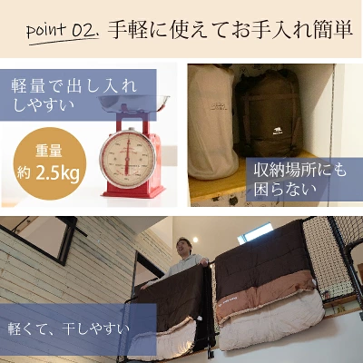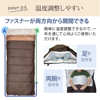 また、全身を包み込むような安心感も得られるのが魅力です。体を動かすことが多い人や、狭い寝袋に抵抗がある人には向いているといえそうです。開口部のファスナーを開ければ布団のようにも使えるため、季節を問わず活躍しますよ。